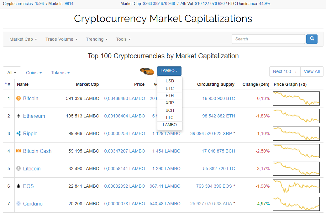 Создатели популярного аналитического сервиса Coinmarketcap добавили возможность выбора пресловутой LAMBO в качестве котируемой «валюты». Таким образом, теперь пользователи сервиса смогут быстро узнать, какую часть от автомобиля марки Lamborghini можно купить за одну монету базовой криптовалюты.