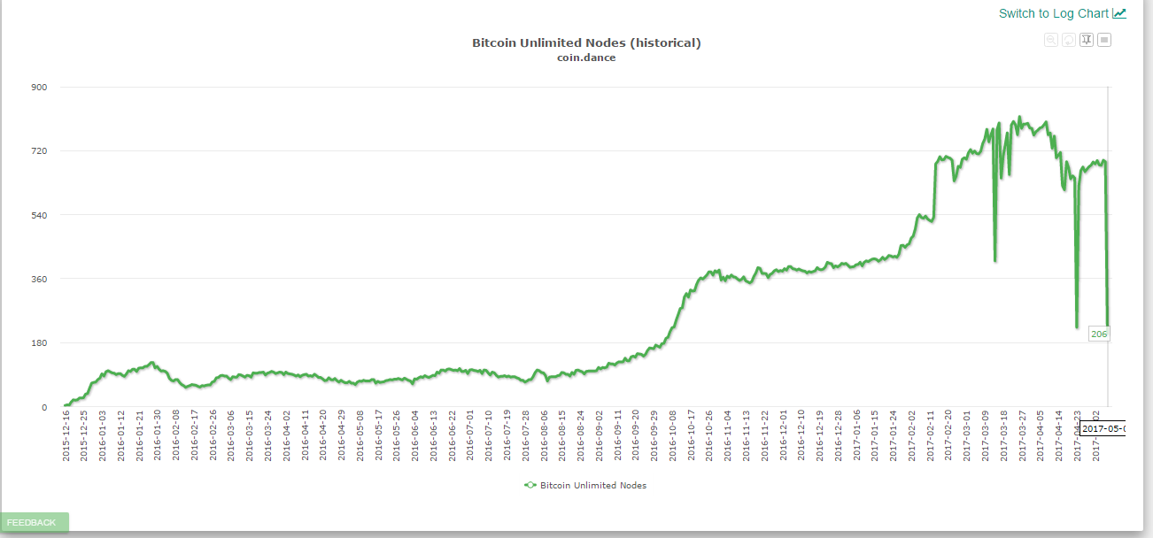 Согласно данным сервиса Coin.dance, к 06:55 GMT число работающих нод Bitcoin Unlimited (BU) составляет 206. До этого среднее число действующих нод BU составляло примерно 680.