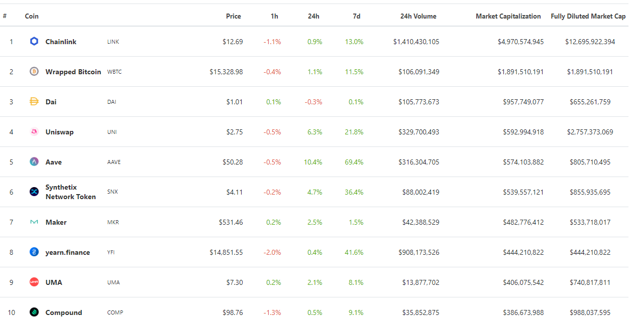 Продолжила рост и капитализация рынка DeFi-токенов, где монеты ряда ведущих проектов, включая Aave, Synthetix и yEarn.Finance, подорожали за неделю значительно больше крупнейших криптовалют.