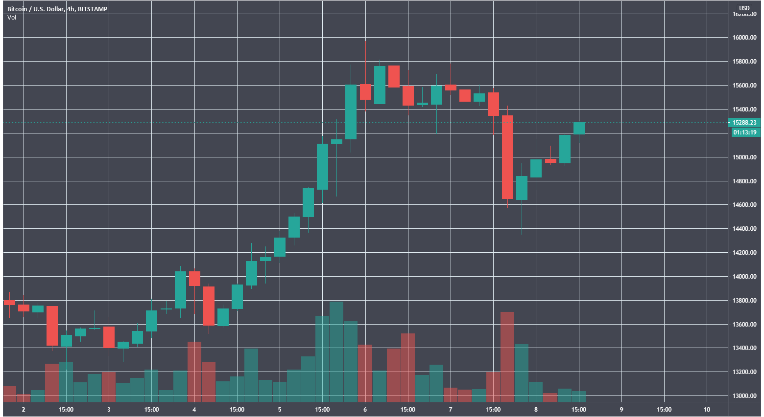 Эту отметку покорить не удалось и началась коррекция. Цена в моменте падала ниже $14 500, но на момент написания вернулась выше $15 000.