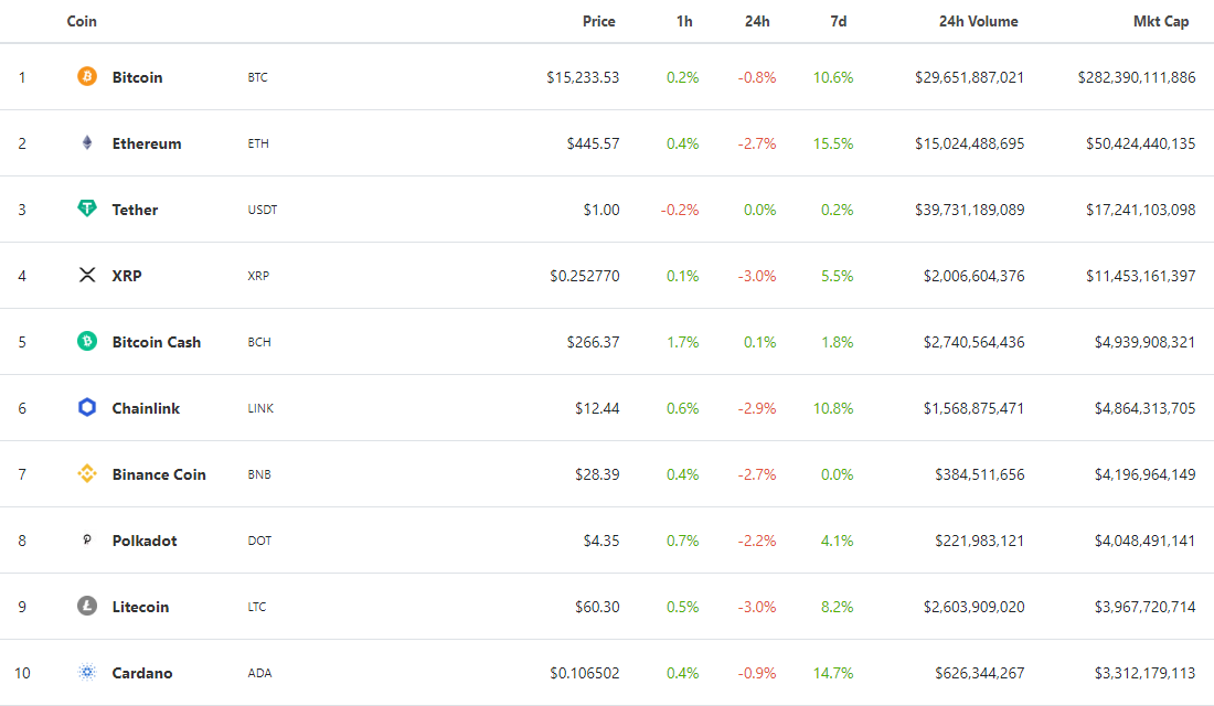 Некоторые альткоины превзошли биткоин по темпам роста. Cardano (ADA) и Ethereum (ETH) подорожали за период на 14,7% и 15,5% соответственно против 10,6% у биткоина (Coingecko).