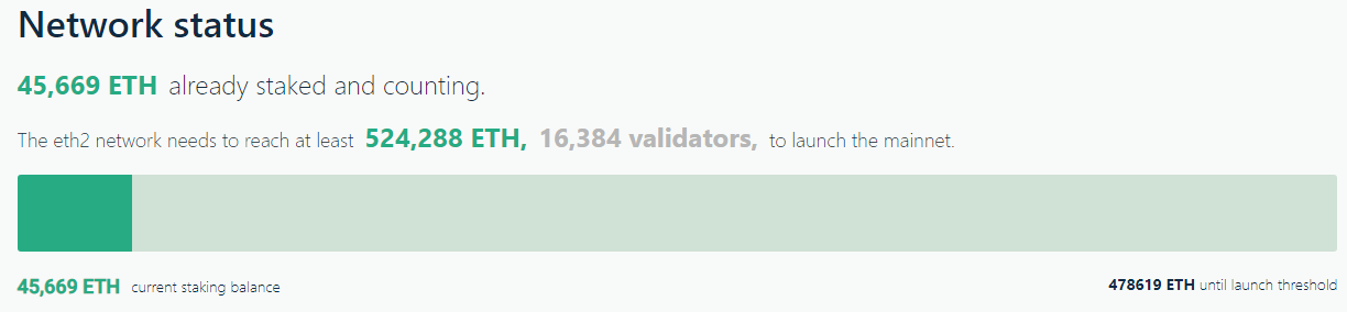 На момент написания, стейкеры заблокировали в сети 45 669 ETH, что составляет менее 10% от требуемого для ее запуска объема.