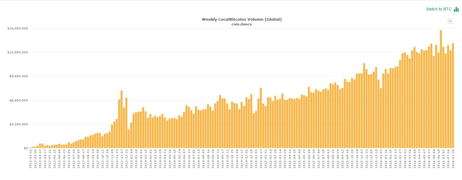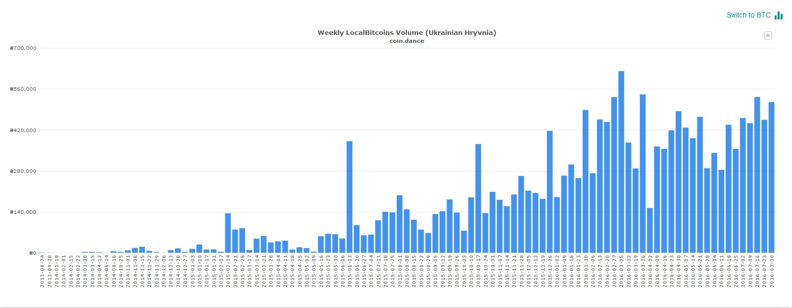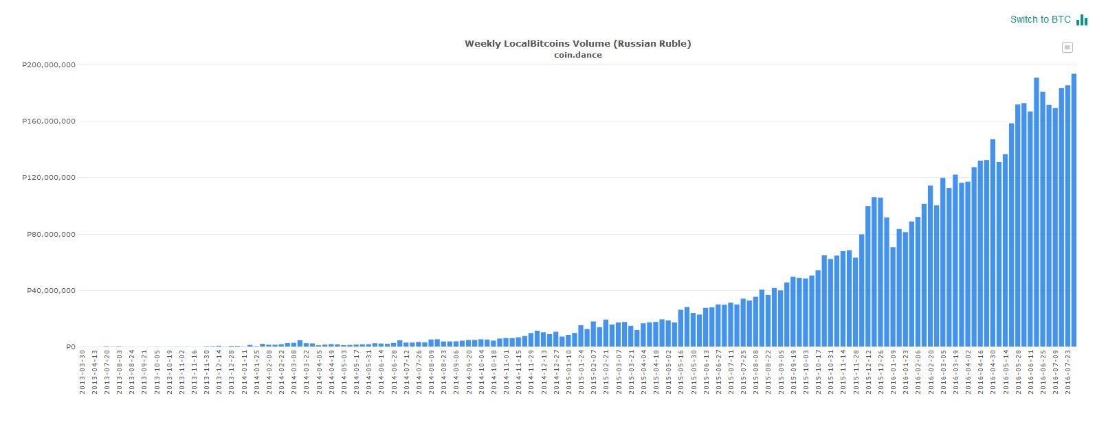 Несмотря на неопределённую позицию российского правительства по отношению к криптовалютам, на прошлой неделе объём биткоин-торгов побил все рекорды. Общий объём сделок составил почти 193,5 миллиона рублей, предыдущий рекорд был поставлен 18 июня текущего года, когда недельный объём торгов составил более 190 миллионов рублей. Об этом сообщает аналитический ресурс coin.dance.