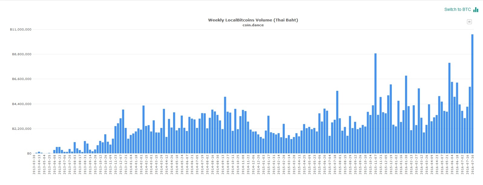 За пределами СНГ стоит отметить такие страны, как Таиланд и Венесуэла. В Таиланде объём торгов на прошлой неделе увеличился почти вдвое, с 5,9 миллиона бат до 10,5 миллиона. В Венесуэле же интерес к криптовалютам растёт медленно, но стабильно. Здесь рынок увеличился на протяжении года с 8,5 миллионов боливаров до 117 миллионов.