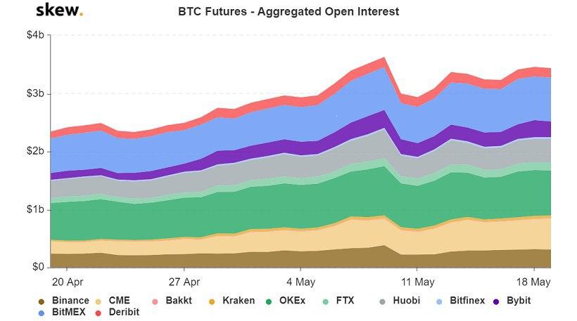 На рынке биткоин-фьючерсов наблюдается двоевластие BitMEX и OKEx. В совокупном объеме открытых позиций в $3,44 млрд на них приходится 22,1% и 22,5% рынка соответственно. Оставшиеся 55,4% рынка поделены между восемью другими участниками, с наибольшей долей у Huobi в 11,9%. Доля Deribit составляет 4,7%.
