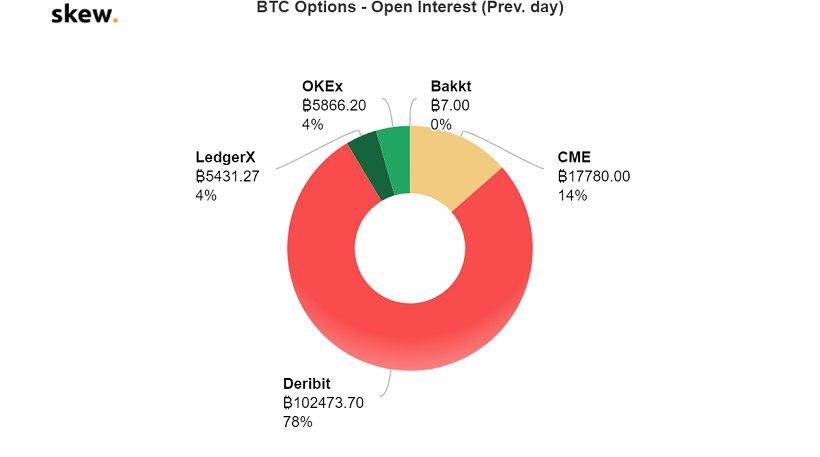 По данным Skew, Deribit доминирует на рынке этих производных на биткоин, занимая долю в 78% по показателю открытого интереса. Ближайшим преследователем выступает Чикагская товарная биржа (CME) с долей в 14%. В разрезе объемов торгов девять из десяти опционов покупаются и продаются на Deribit.