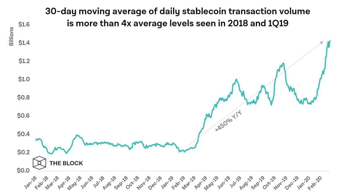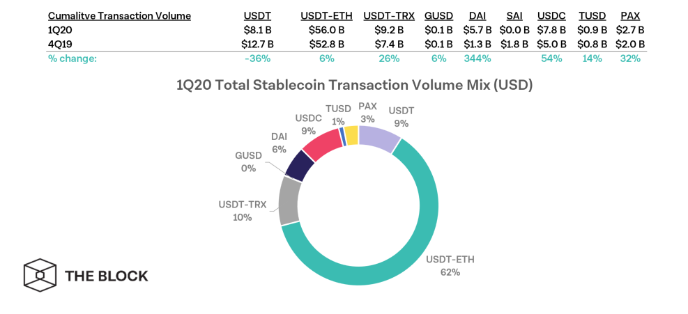 Совокупный объем стейблкоин-транзакций в течение первого квартала 2020 года, до окончания которого менее пяти дней, превысил $90 млрд. Рост по сравнению с предыдущим периодом составил 8%, а за год — $280%. Подавляющее большинство операций со «стабильными монетами» предположительно связано с торговой активностью.
