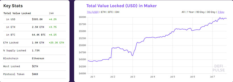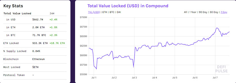 В июне на рынке произошла смена лидера по этому показателю — первую строчку теперь занимает Compound, который сместил MakerDAO. Объем заблокированных средств в первом составляет $661,3 млн, во втором — $596,7 млн. Разрыв между лидерами существенно сократился. Неделей ранее он составлял $172,6 млн против текущих $64,6 млн.