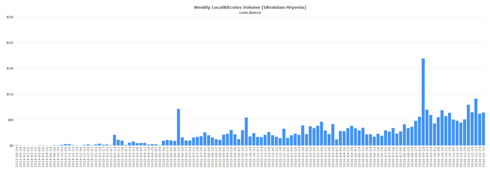 В Украине же на протяжении двух последних недель рынок практически стабилен. На прошлой неделе объем торгов составил 77 BTC (1,923 млн гривен). Однако, благодаря ускорившейся девальвации украинской валюты, в гривневом эквиваленте зафиксирован рост на 221 млн гривен.