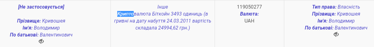 Владимир Кривошея работает коммерческим директором компании «Стар Шайн Шипинг». Помимо биткоинов, он задекларировал квартиру площадью 46,9 м2 в Одессе и два земельных участка в Одесской области.