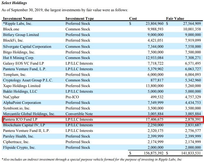 По данным финансового отчета за третий квартал 2019 года, Galaxy Digital инвестировал в Pantera ICO $17,4 млн, однако на данный момент реальная стоимость вложений оценивается менее чем в $2,9 млн.