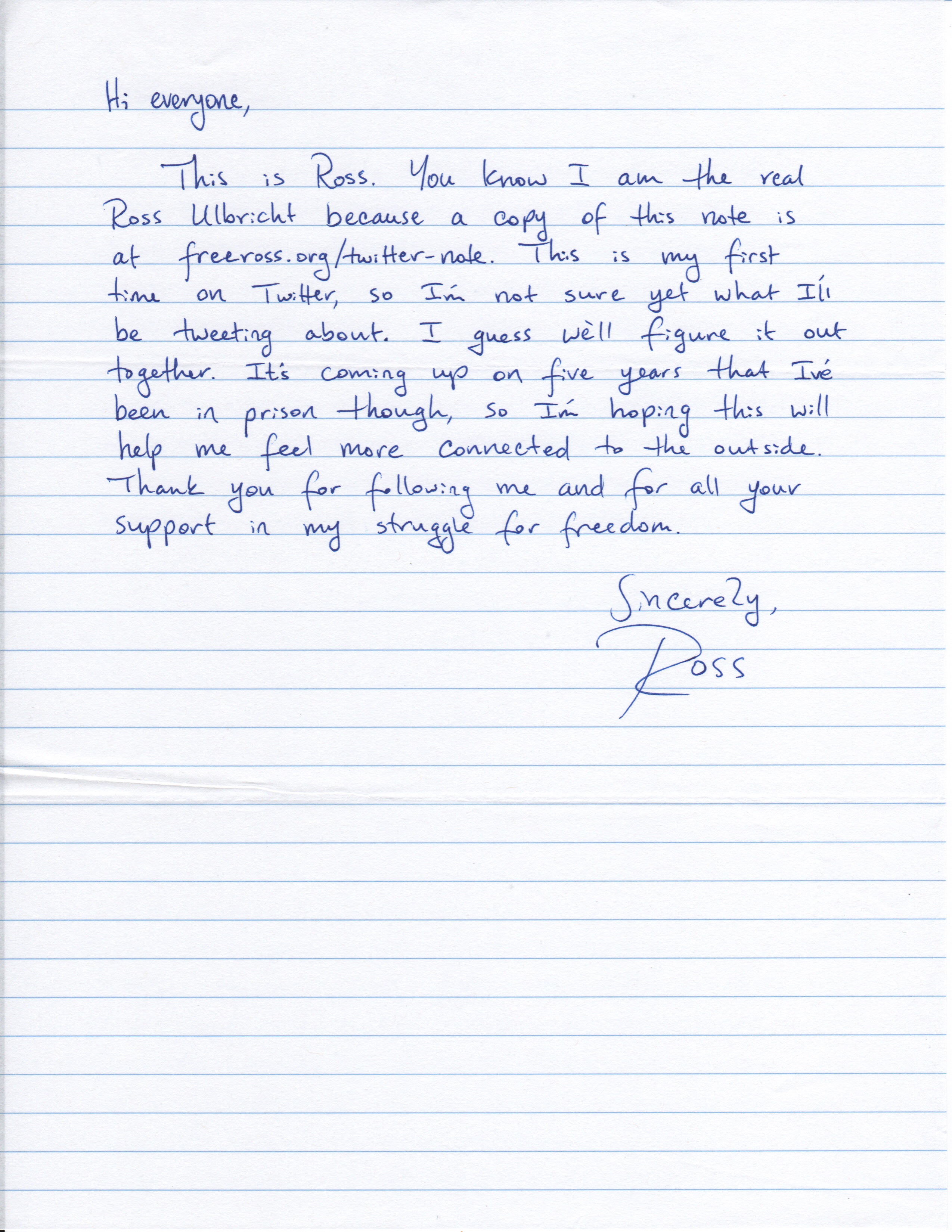 Это Росс. Вы знаете, что я настоящий Росс Ульбрихт, потому что копия этой записки выложена на freeross.org/twitter-note. Я впервые в Twitter и пока еще не знаю, о чем буду писать. Думаю, мы решим это вместе. Уже пять лет как я нахожусь в тюрьме, и я надеюсь, что это поможет мне чувствовать себя ближе к внешнему миру. Спасибо, что подписались на меня и за всю вашу поддержку в борьбе за мою свободу.