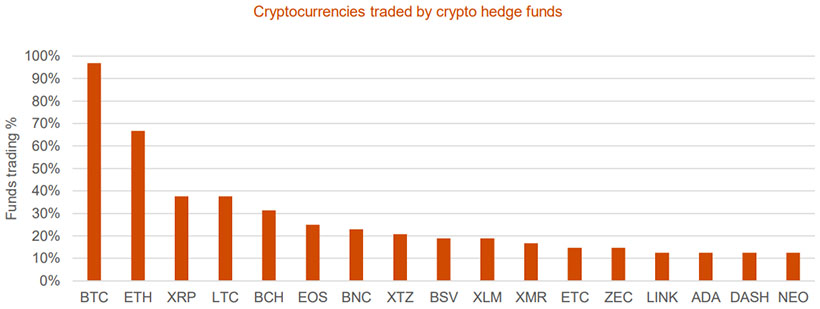 Абсолютное большинство фондов в прошлом году торговало биткоином (97%). Далее по популярности следовали Ethereum (67%), XRP (38%), Litecoin (38%), Bitcoin Cash (31%) и EOS (25%).