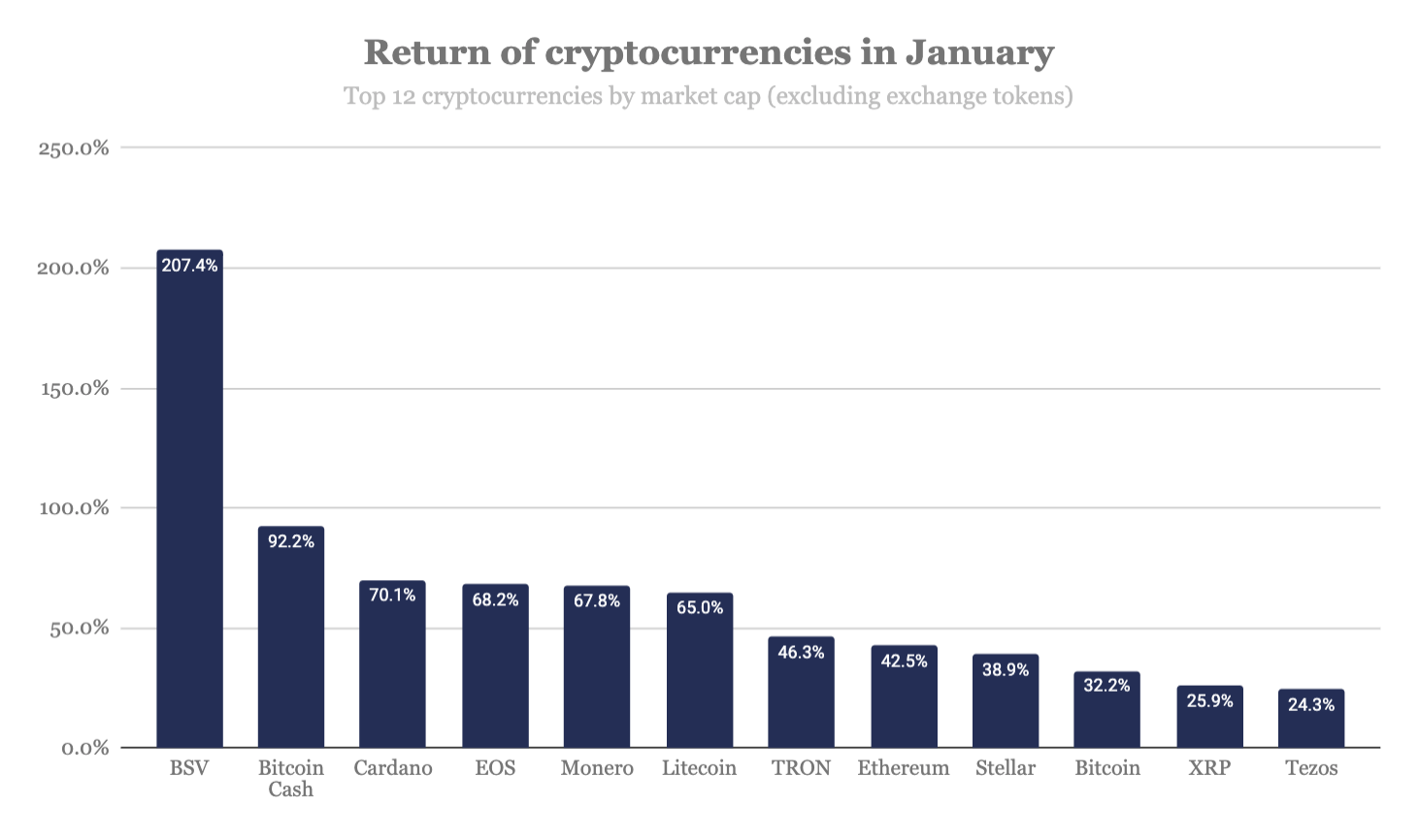 В январе цена биткоина выросла на 32%, капитализация криптовалюты увеличилась примерно на $40 млрд. Ethereum за это время подорожал на 42%, а Bitcoin SV — более чем в три раза. Среди популярных криптоактивов наихудшая динамика была у Tezos и XRP, однако и эти монеты поднялись более чем на 20%.