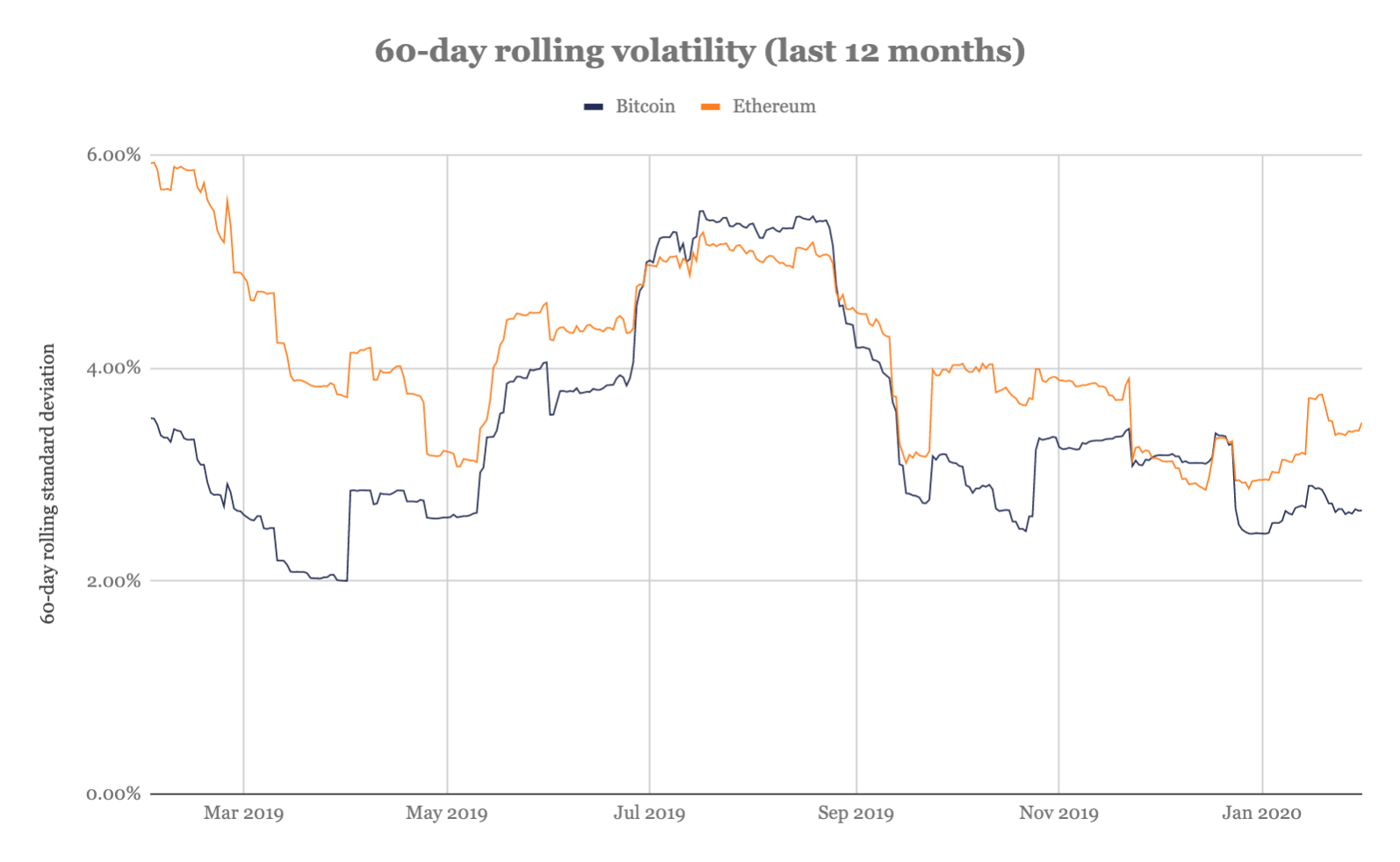 Волатильность BTC и ETH немного увеличилась в январе. В декабре размах ценовых колебаний обоих активов был примерно одинаков, однако в начале года Ethereum вновь стал немного волатильнее биткоина: