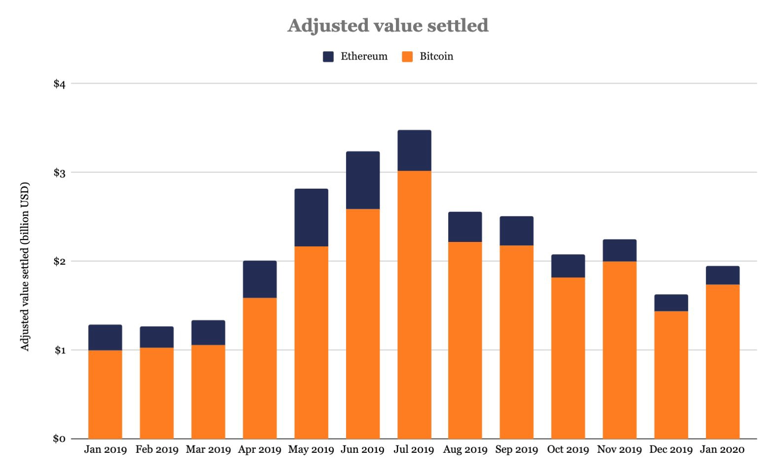 В январе также увеличились объемы стоимости, переданной через блокчейны BTC и ETH: