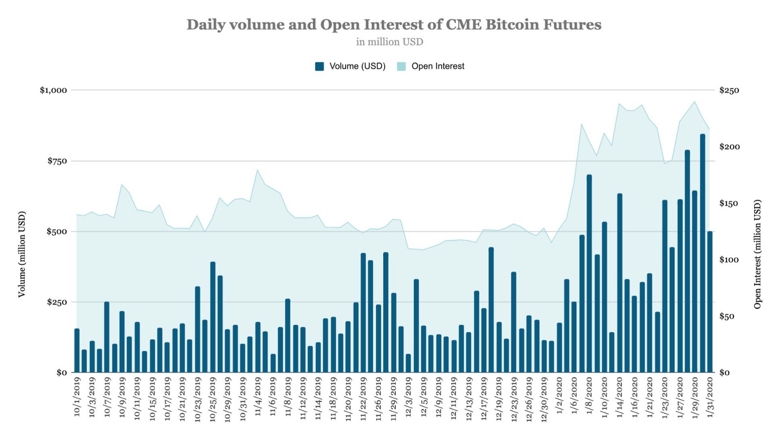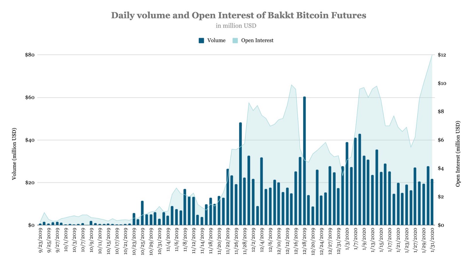 Активность на Bakkt продолжает увеличиваться. Открытый интерес на этой регулируемой платформе достиг в конце января исторического максимума на отметке $12 млн, а средний объем торгов составил $26,45 млн.