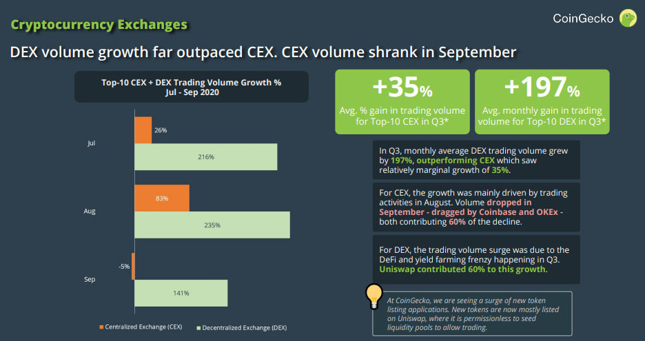 Торговые обороты децентрализованных бирж (DEX) демонстрируют взрывной рост, в то время как на централизованных площадках (CEX) объемы сокращаются, отметили специалисты CoinGecko в отчете за третий квартал.