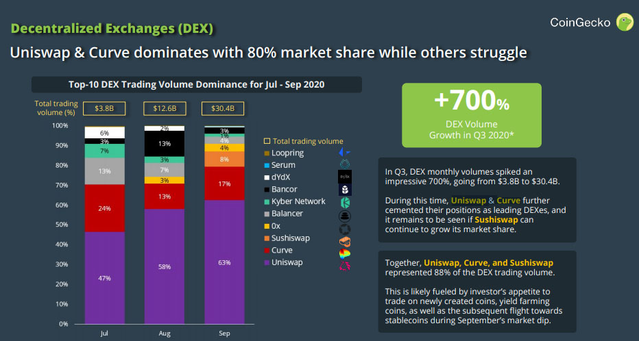 Объем торгов на DEX за квартал вырос на 700% — с $3,8 млрд в июле до $30,4 млрд в сентябре. 60% прироста обеспечила Uniswap.