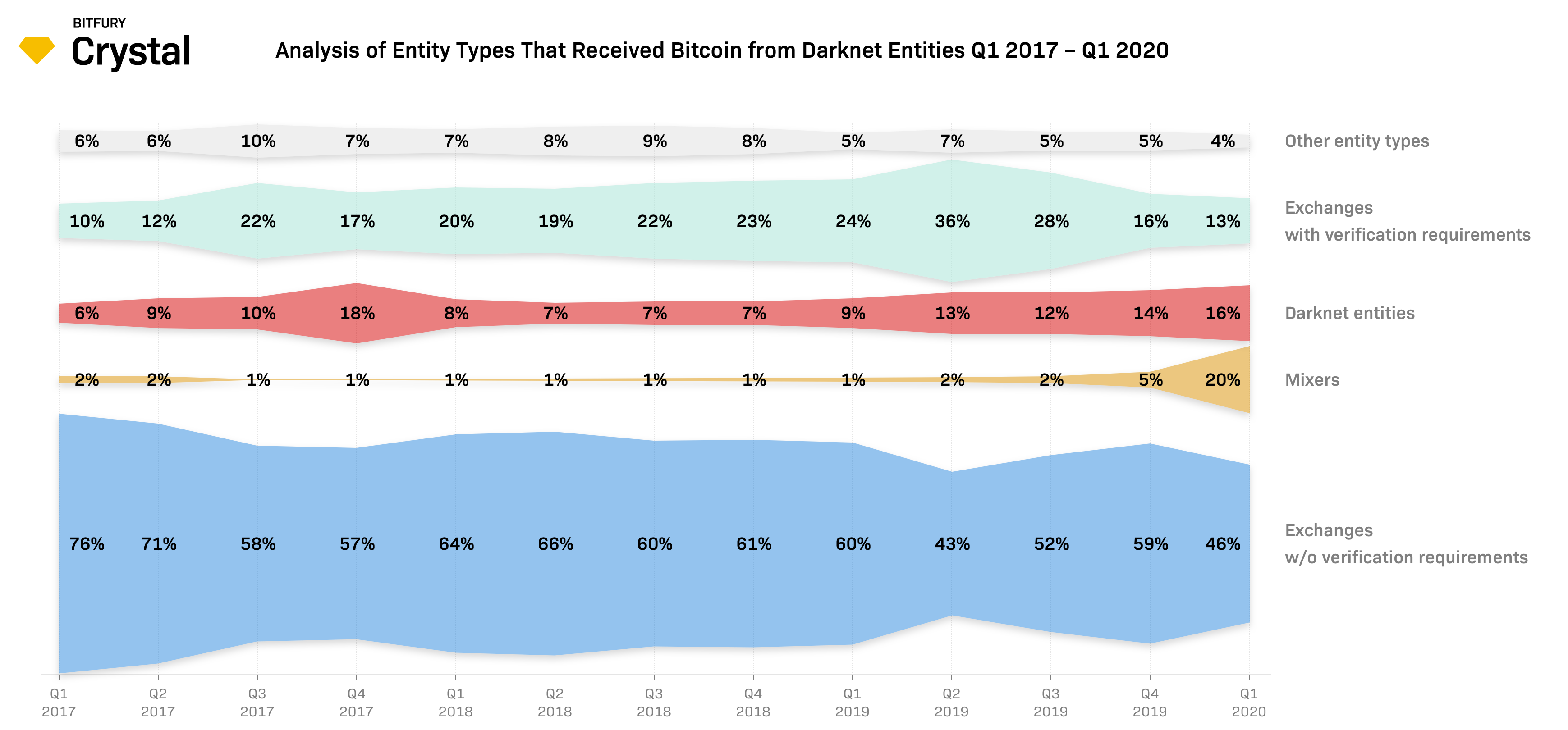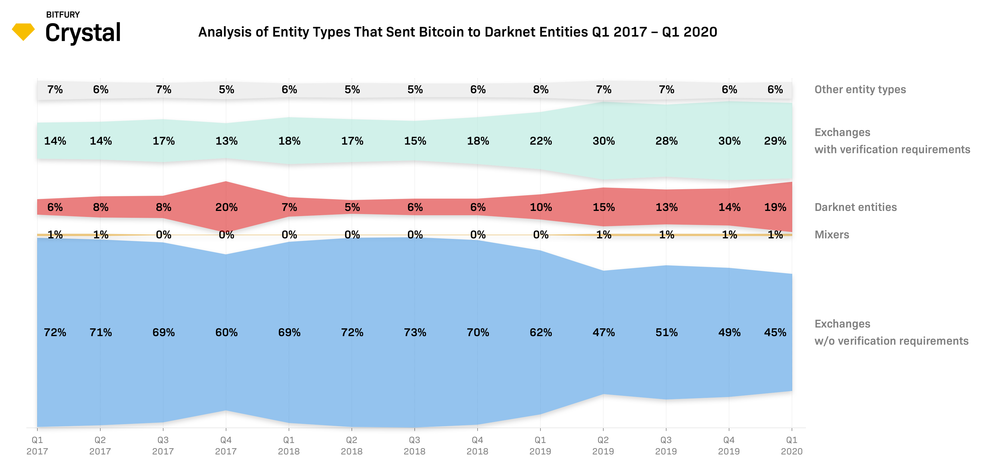 По данным первого квартала специалисты Crystal отметили, что 45% биткоинов организации даркнета получили с криптоторговых платформ, которые не требуют верификации. С бирж, придерживающихся правил KYC, поступило 29% от общего объема, а с сервисов микширования — 1%.