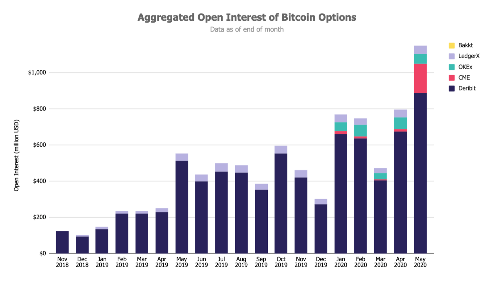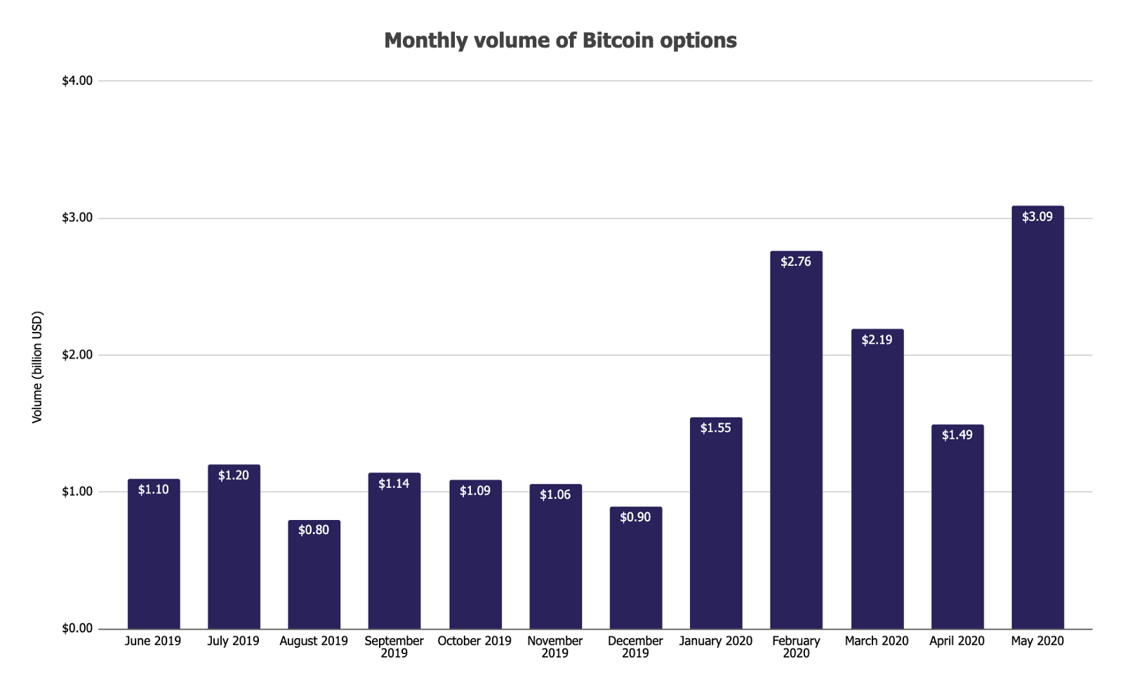 По сравнению с апрелем в мае общий объем торгов BTC-опционов вырос более чем на 100%.