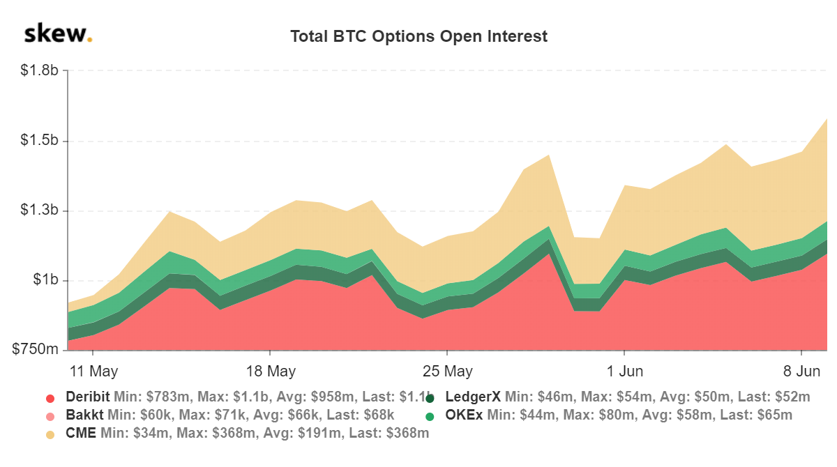 Объем открытых позиций (открытый интерес, OI) по биткоин-опционам преодолел отметку в $1,5 млрд.