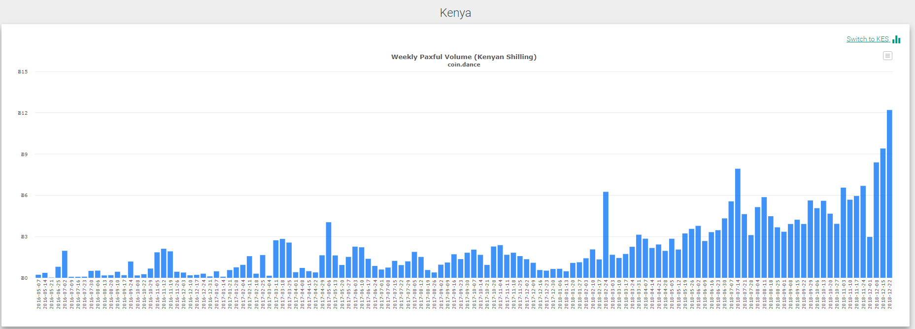 Также примечательно, что медвежий тренд 2018 года не снизил объемы торгов на платформе Paxful. Например, p2p-торговля биткоином стабильно растет в Кении:
