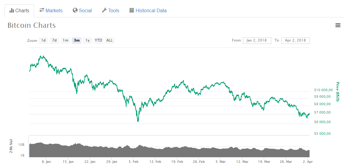 Напомним, в первых числах января первая криптовалюта торговалась в районе чуть ниже $14 000, поднявшись 6 января до отметок выше $17 000. В понедельник, 2 апреля, средневзвешенный курс биткоина, перед этим упав почти до $6 500, снова вернулся на уровень выше $7 000.