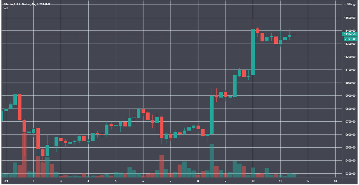 Ранее аналитики отмечали важность уровня сопротивления на отметке $11 200. С 10 октября биткоин торгуется выше нее. На момент написания цена находится в районе $11 370.