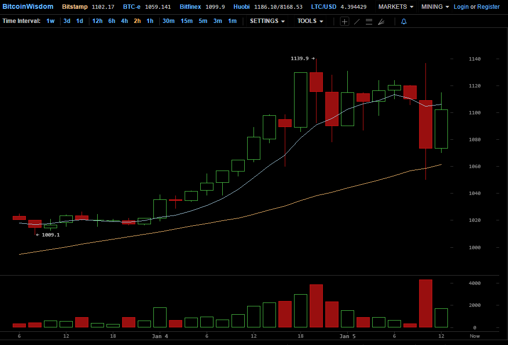 На момент публикации средневзвешенный курс биткоина по данным Coinmarketcap составляет $1118.79.