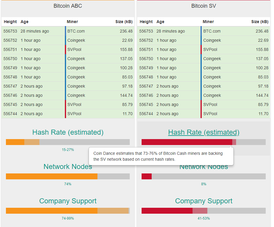 Более того, примерно за час до хардфорка поддержка майнерами решения Bitcoin SV составляет более 73%.