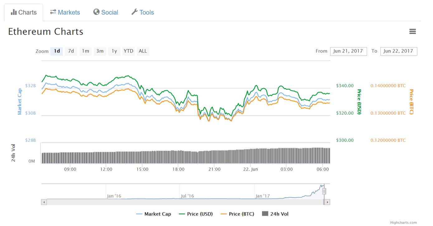 Средневзвешенный курс ETH, по данным Coinmarketcap, опускался в течение минувшей ночи до $319 и на момент публикации составляет $335.