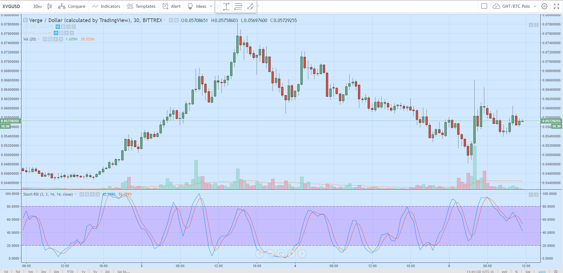 Ниже на графике видно, как по мере распространения информации о проблемах с Verge, цена этой криптовалюты снизилась с $0,075 до $0,057:
