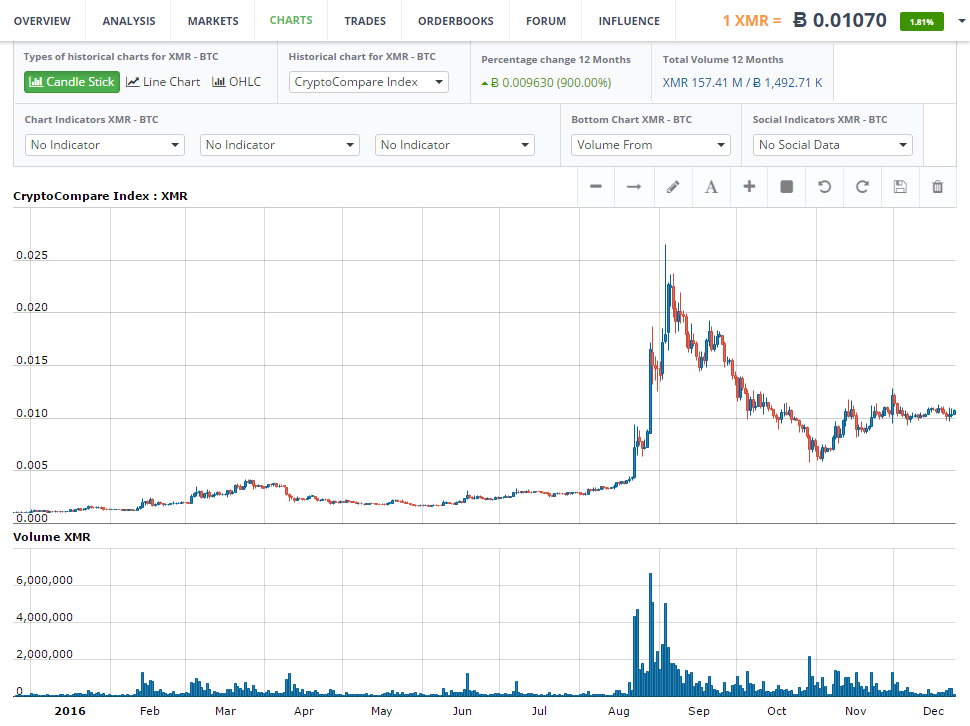 Звание абсолютного чемпиона года заслуженно достается Monero – если в начале исследуемого периода XMR стоил 0.00107593 BTC, сегодня монета торгуется в районе 0.0107 BTC. Таким образом, по отношению к биткоину за последние 12 месяцев XMR вырос в цене на 900%, в то время как по отношению к доллару этот показатель оказался еще более фантастическим: 1958%! При этом стоит принять во внимание, что этот показатель мог быть и намного выше: выйдя на пиковые показатели в начале осени на фоне новостей об интеграции Monero в несколько популярных в даркнете площадок, в дальнейшем XMR упал в стоимости. Тем не менее, с ноября наблюдается устойчивый тренд на повышение, который сохраняется и по сей день.