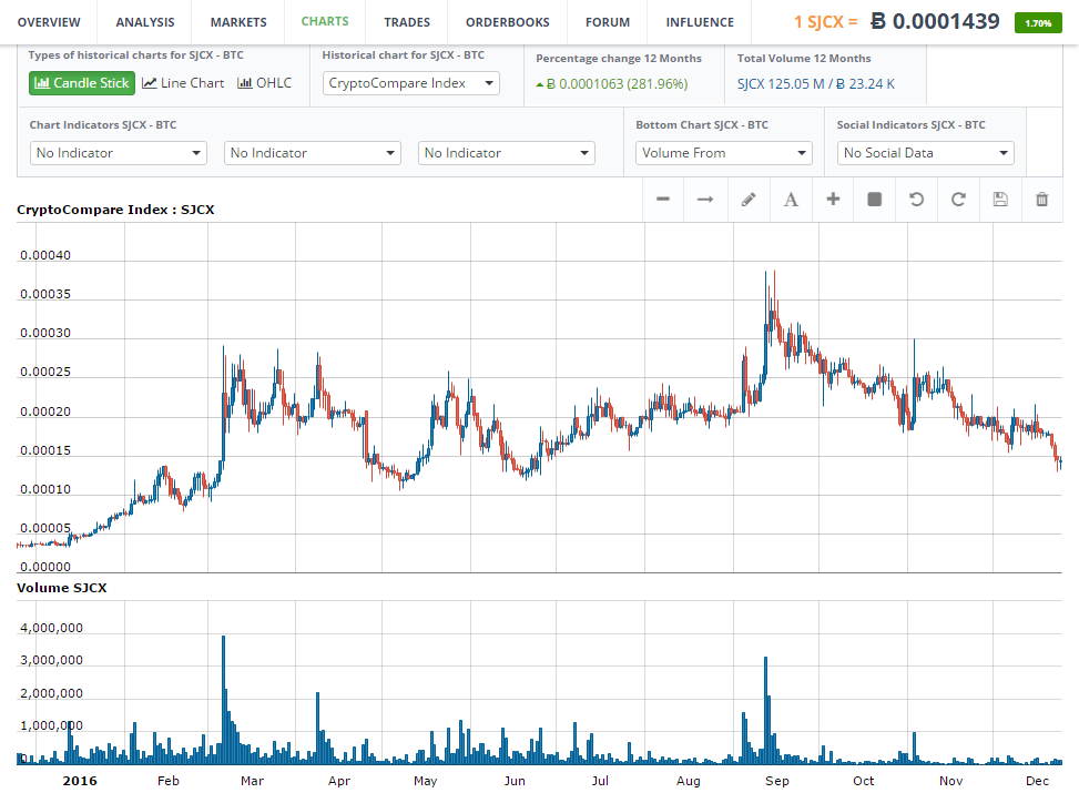 Как и Sia, Storj является облачной сетью хранения данных и использует в этих целях собственный токен. Во многом похож и годовой график изменения биржевых цен: достигнув пикового значения в сентябре, последние месяцы SJCX падает в стоимости. Тем не менее, почти 300% прибыли за год не могут не впечатлять.