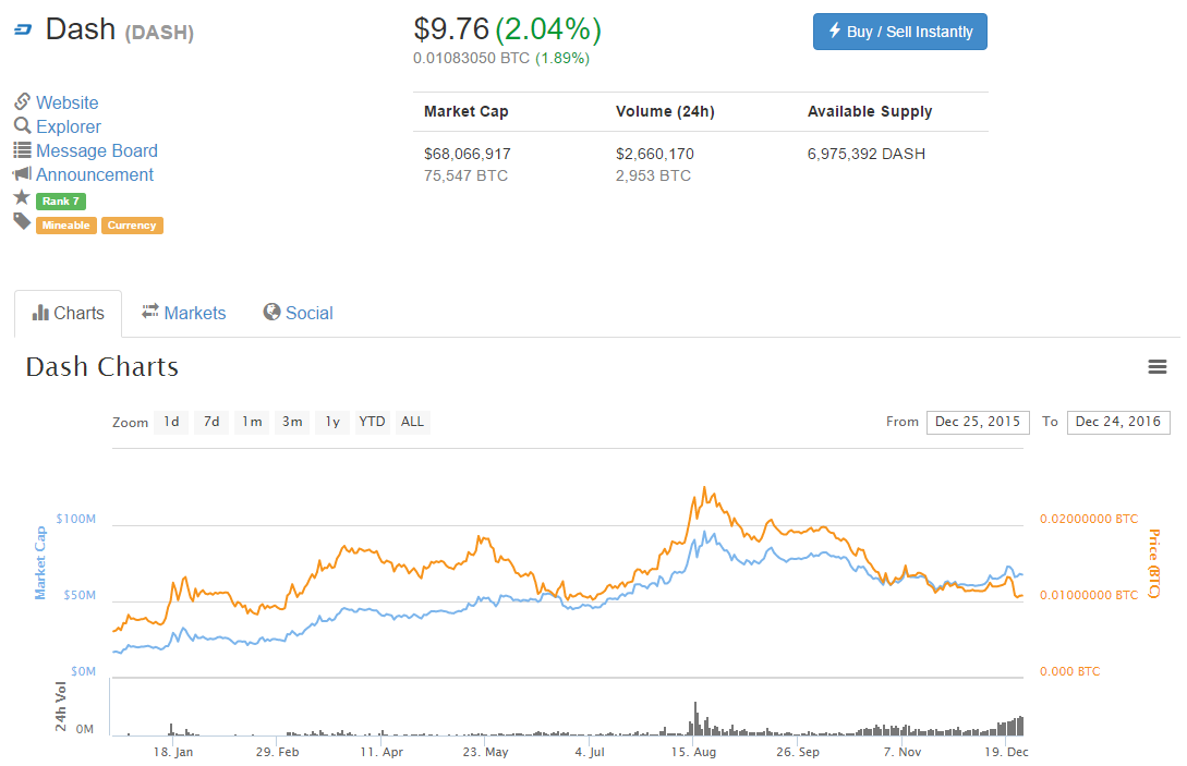 Приведенные ниже данные указаны по состоянию на 24 декабря 2016 года и в силу природы криптовалют, которые постоянно находятся в движении, могут отличаться от актуальных данных на момент публикации. Процентное соотношение указано к биткоину и отличается от показателей к доллару.