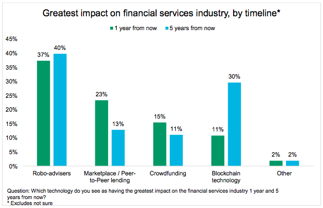 Второй по значимости технологией, которая, как ожидают респонденты, окажет наибольшее влияние на сектор финансовых услуг, был назван блокчейн. 30% участников исследования предположили, что лежащая в основе биткоина технология обладает наибольшим потенциалом в средней и долгосрочной перспективе.