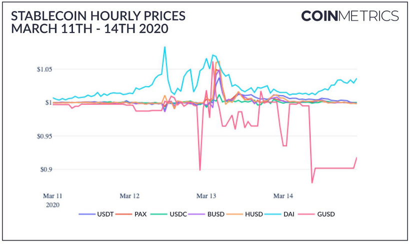 Аналитики также изучили, как ведущие стейблкоины реагировали на мартовский обвал рынка. Волатильность продемонстрировали все монеты, но хуже всех себя показали Gemini Dollar (GUSD) и DAI. Рыночная стоимость первого в моменте опустилась до $0,90.
