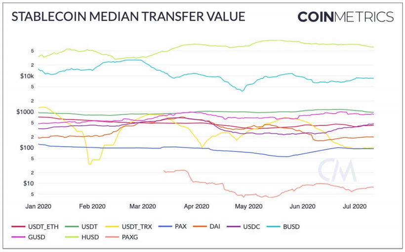 Выпущенные популярными биржами стабильные монеты оказались в лидерах по медианной сумме перевода, несмотря на относительно низкую капитализацию. Для BUSD от Binance этот показатель составил $8000, а для HUSD от Huobi — $75 500.