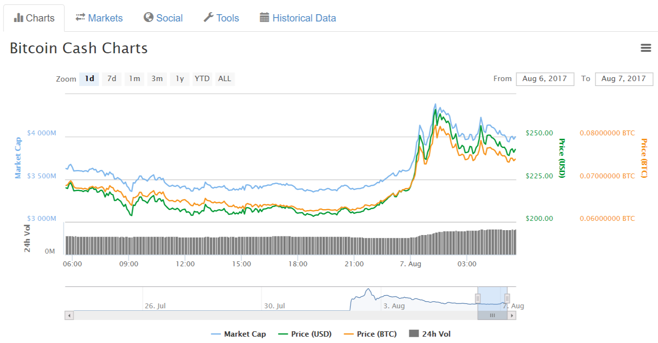 Тем не менее, по состоянию на утро понедельника цена BCH, упав накануне почти до $200, снова пошла вверх: на момент публикации (09:15 Киев / Москва) средневзвешенный курс составлял $244.58.