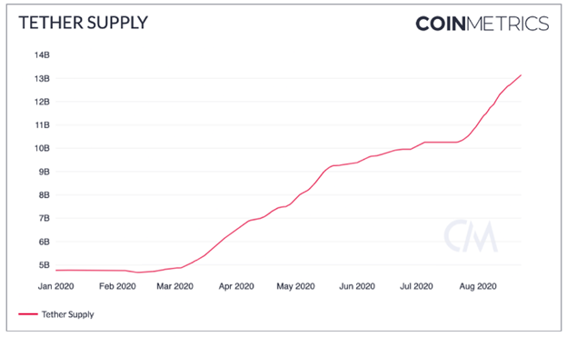 21 августа эмиссия USDT превысила порог в 13 млрд привязанных к доллару в соотношении 1:1 монет. Еще 1 июня показатель составлял менее $10 млрд, а 1 марта – менее $5 млрд.