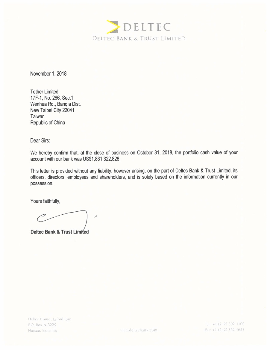 Эмитент привязанного к доллару США стейблкоина USDT компания Tether Limited официально подтвердила сотрудничество с Deltec Bank — небольшим финансовым институтом с Багамских островов. Также компания представила письмо, исходя из которого она обладает достаточными средствами для обеспечения всего объема выпущенных токенов USDT.