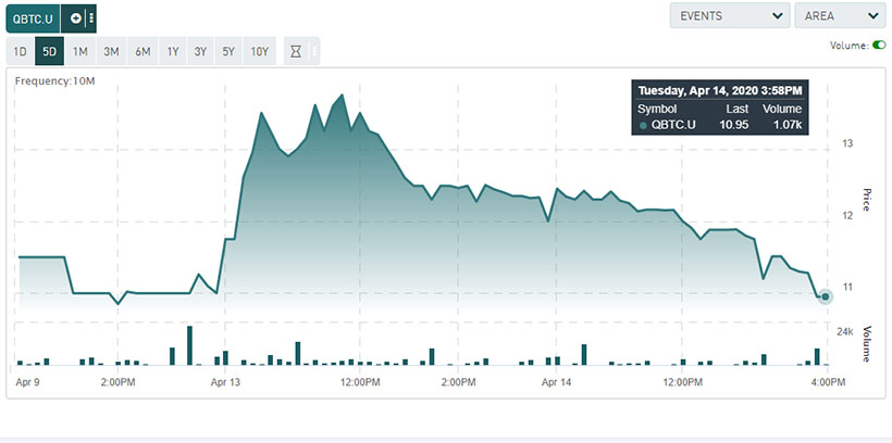 3iQ в октябре прошлого года получила предварительное согласие Комиссии по ценным бумагам Онтарио (OSC) на запуск инвестиционного биткоин-фонда для розничных инвесторов. Торговля акциями The Bitcoin Fund под тикетом QBTC.U на Торонтской фондовой бирже (TSX) началась 9 апреля. Вчера, 14 апреля, цена бумаг на закрытие составила $10,95, максимальных пока котировок $13,75 акции фонда достигли в ходе торгов днем ранее.