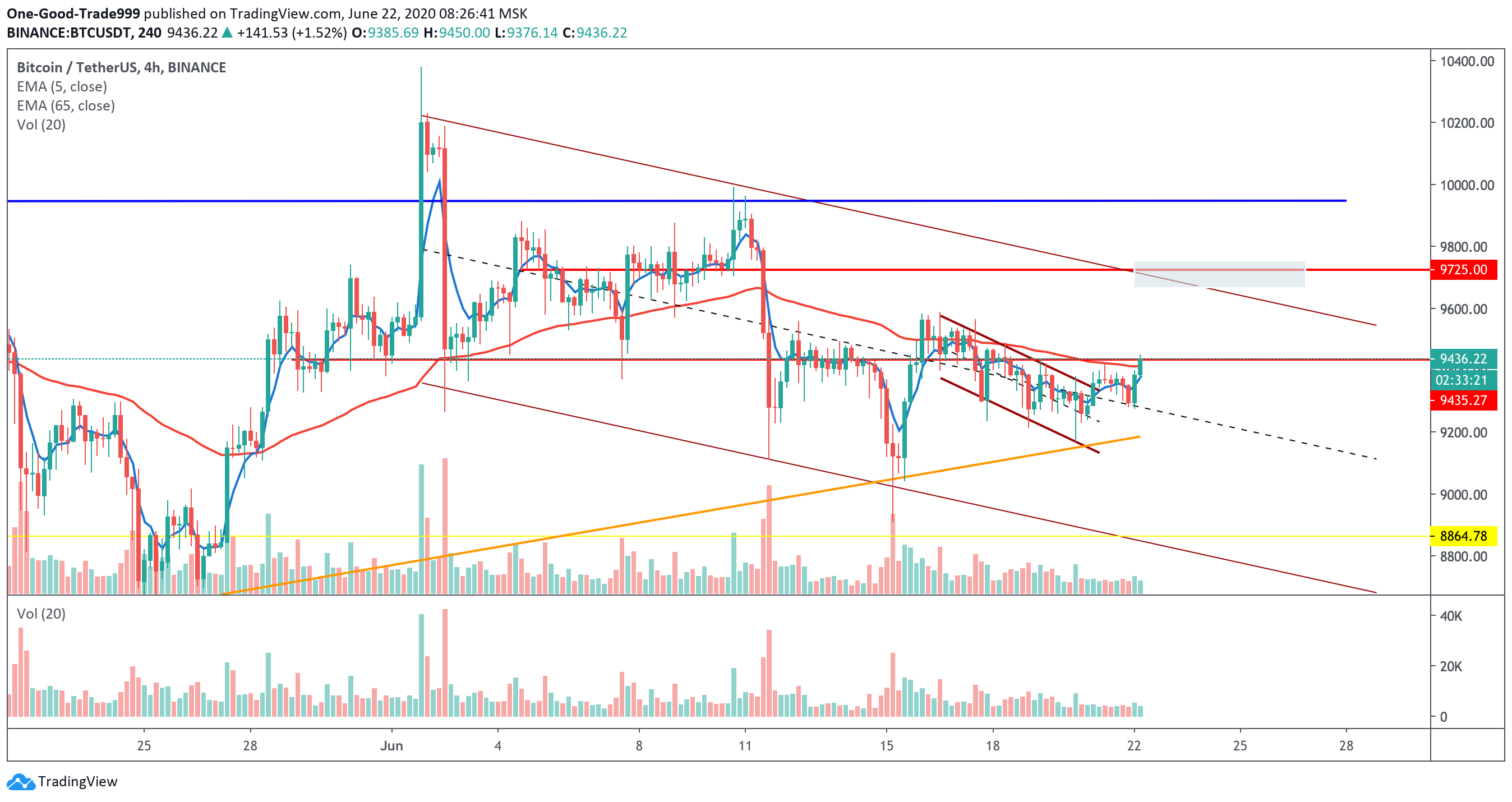 В случае успеха (закрепление выше $9450) можно ожидать продолжения роста к верхней границе локального нисходящего канала ($9660-$9725):