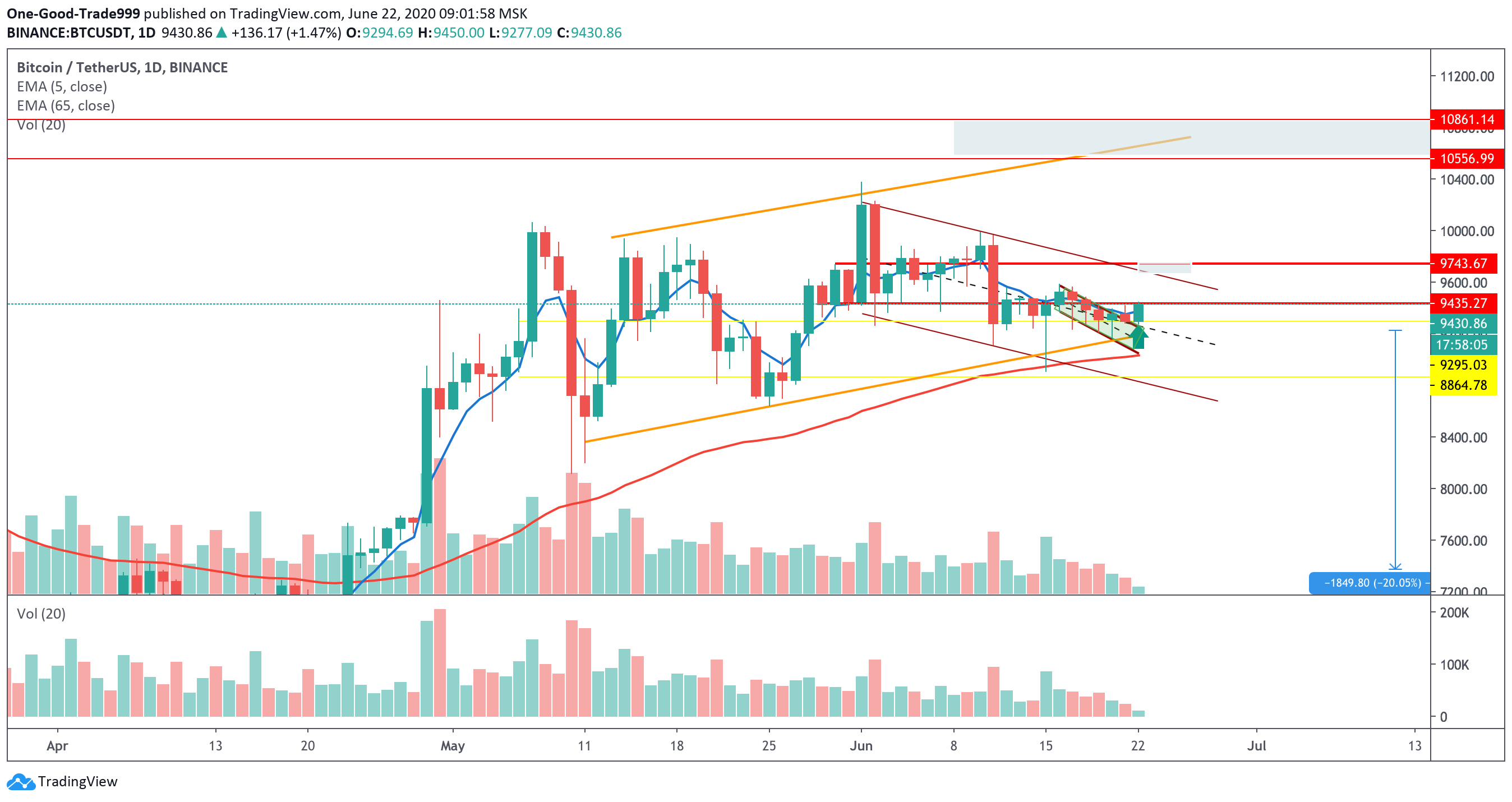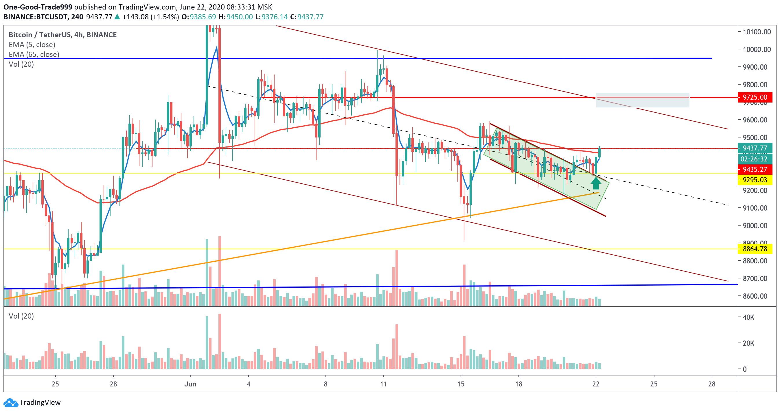 Для продолжения текущего восходящего движения необходимо удержать поддержку на $9295 (является серединой нисходящего канала и верхней границей краткосрочного нисходящего канала, который биткоин пробил на текущем росте):