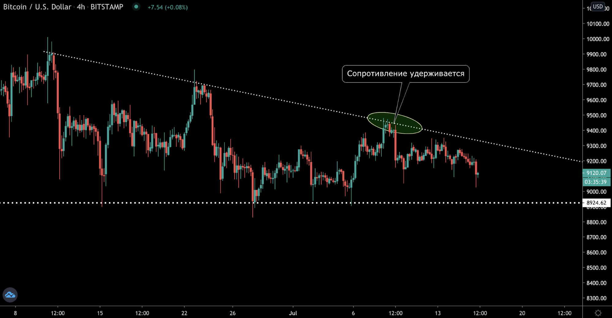 Судя по графику, цена биткоина не смогла пробить верхнюю границу «нисходящего треугольника», что говорит о слабости покупателей. Сейчас цена медленно приближается к зоне поддержки $8900-$9000, где покупатели, скорее всего, начнут агрессивно выкупать биткоин, удерживая уровень.