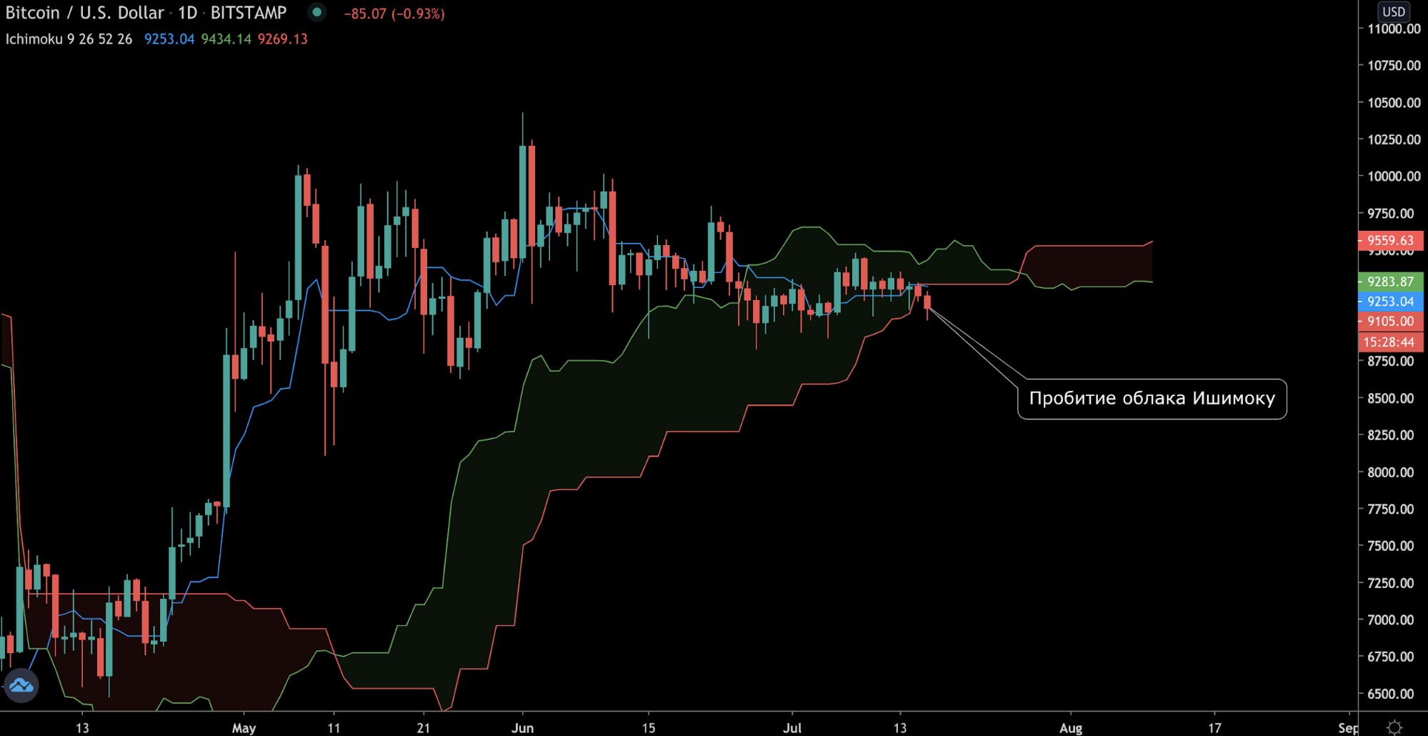 Обращаясь к индикатору «Облако Ишимоку», обнаружим, что цена уже вышла за пределы нижней границы «облака». Это говорит о возможном падении как минимум до уровня поддержки $8600. Мы знаем, что исторически индикатор демонстрировал высокий показатель отработки каждый раз, когда цена пробивала нижнюю или верхнюю границу облака.