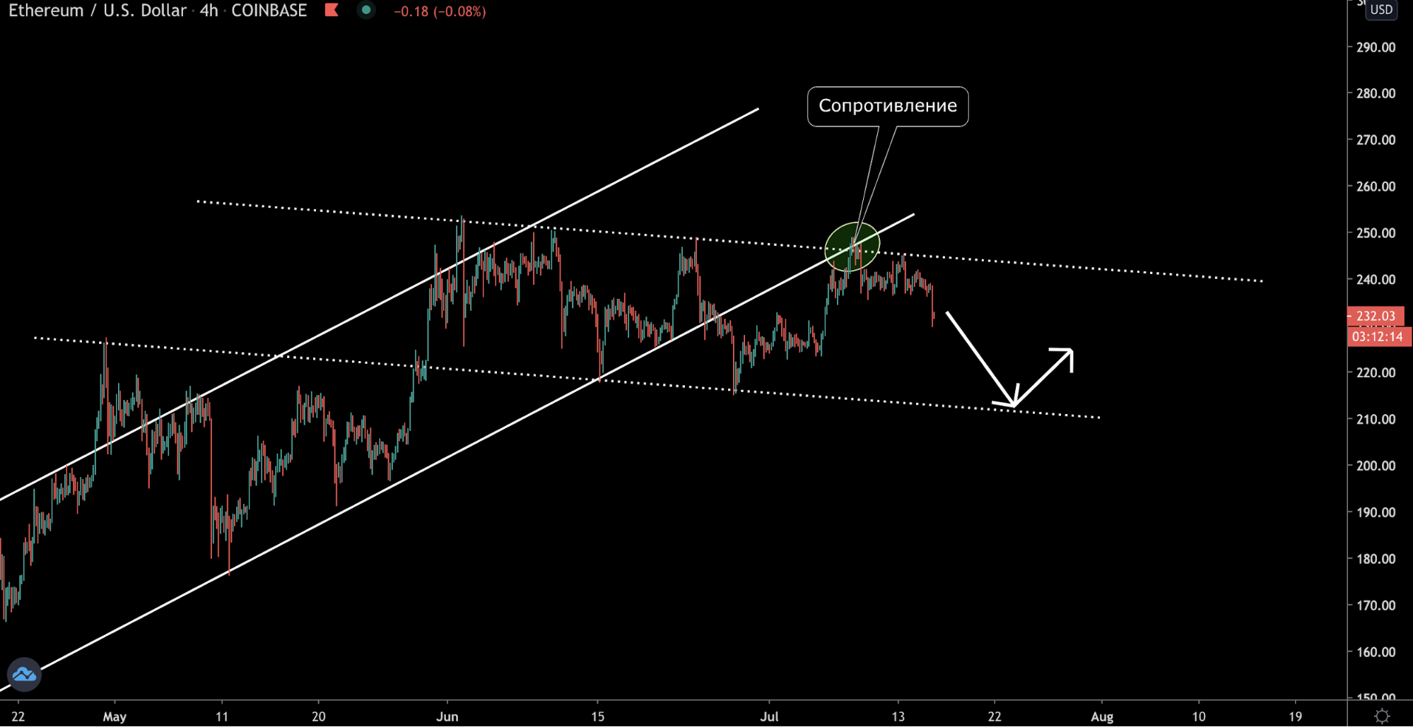 На графике отображено предполагаемое движение цены на основе линий поддержки и сопротивления. ETH является одним из немногих криптовалютных активов, которые «уважают» уровни. Об этом свидетельствует график: