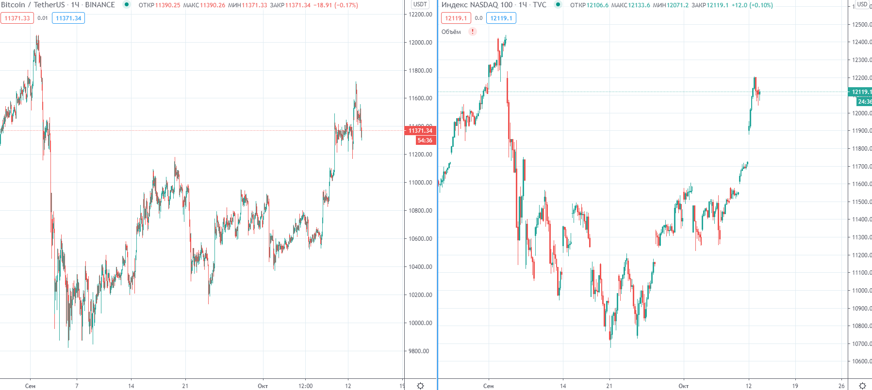 Криптовалютный рынок уже и так чрезмерно сильно отреагировал на позитивную динамику индекса NASDAQ последних недель (сравнение ниже), а корпоративное событие одной из движущих сил индекса — компании Apple — сегодня не всегда имеет позитивное влияние на рынок, чаще бумаги растут лишь на ожиданиях.