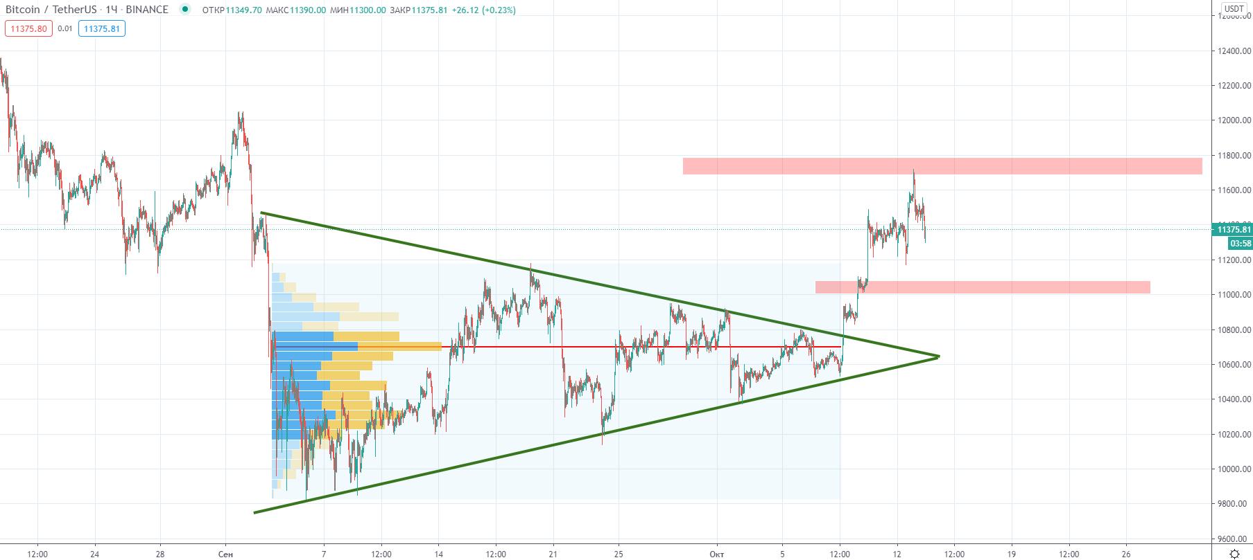 В предыдущем обзоре я ожидал ложного выхода из треугольника наверх с целью кратковременного сбора ликвидности выше $11 000. Данную ликвидность составляют стоп-ордера и ликвидации шорт-позиций.